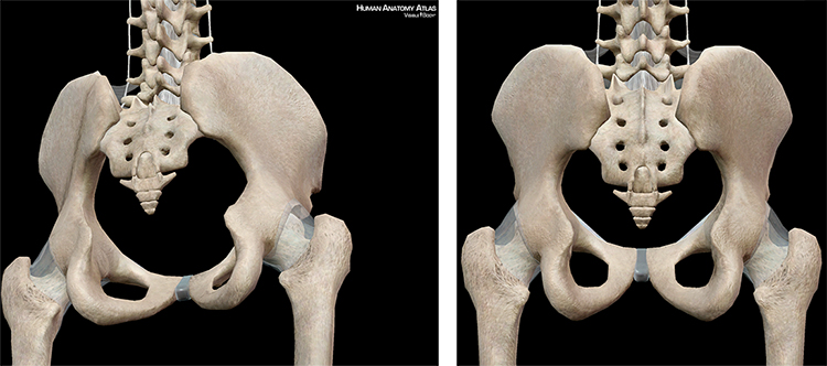 The pelvic skeleton is formed in the area of the back, by the sacrum and the coccyx and anteriorly and to the left and right sides, by a pair of hip bones.